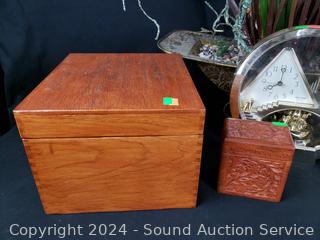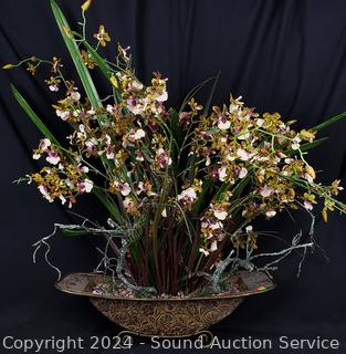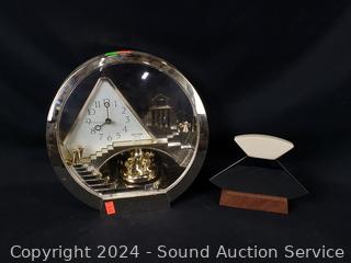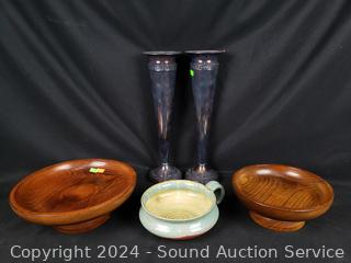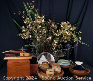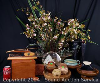 Orchid faux houseplant, rhythm quartz clock, woven baskets, wood bowls, tobacco pipe, handled pottery bowl, E.P.N.S vases, wood helicopter, Ulu & more.