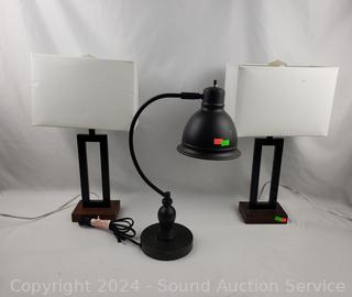 Lot #0021: Pair of Small Side Table Lamps & Bronze Finish Desk Lamp