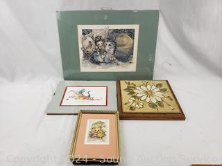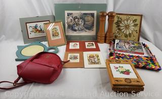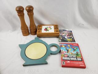 Wood & tile trinket box, trivet, unique candy wrapper purse, Tommy Hilfiger backpack, 2 Super Smash Bros. Wii Games, wood salt shaker & pepper mill, 6 small Bergsma prints. Refer to photos for more details.