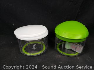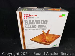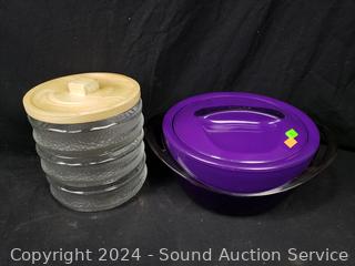 Bamboo Salad Bowl w/serving utensils, 3-tier glass bento container, chopper/container set, Purple Pinnacle insulated steel food storage container 4.75" H x 9.5".