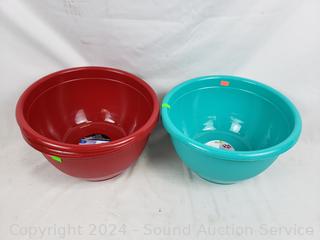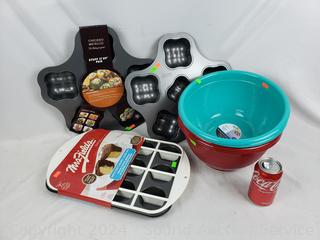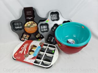 (5) 6qt Mainstays mixing bowls, (3) Stuff it up, Muffing Pans. All appear new, unused.