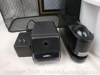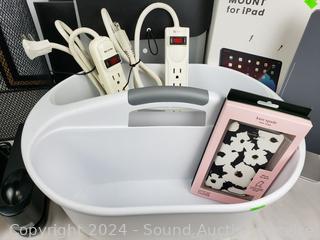 Waste bin, 2 power strips, whiteboard 18" x 22", Kate Spade iPhone X5 Kate Spade case, electric pencil sharpener, file organizers, divided tote, 2 magnetic iPad mounts.