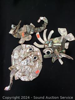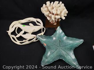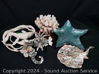 Piece of mounted Coral, 8.5" x 7.5", Starfish Dish 13.5" Dia., Humpback Whale Resin Wall Decor 12" Dia, Seahorse Fish & Sting Ray Sculptures (crafted from seashells, seahorse has a loose head) 6.5" to 12",