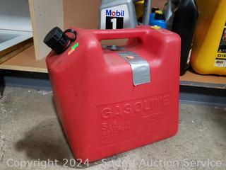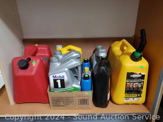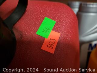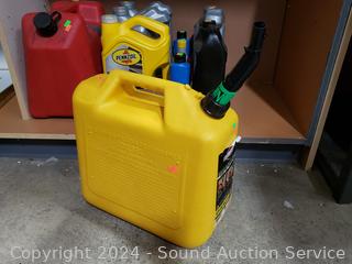 Lot #0146: 2 5 Gal. Fuel Cans & 8 Bottles of Assorted Motor Oil