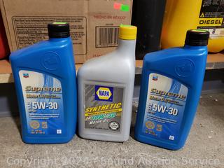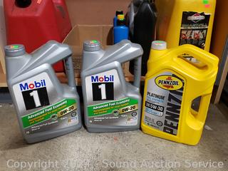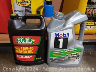 (3) 1 Gal. 0W-20, (1) 1 Gal. 15W-40, (1) 1 Gal. 5W-30, (2) 1qt 5W-30, (1) 1qt 10W-30. All Appear full or mostly full.