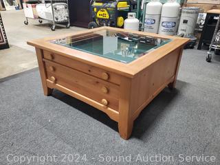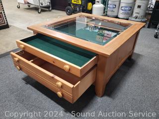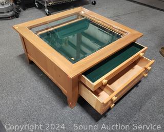 Lot #0014: 2 Drawer Passthrough Glass Top Display Coffee Table