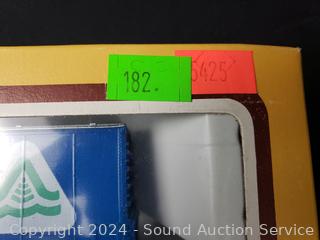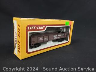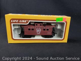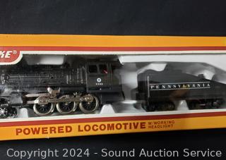 All in original packaging, appear unused. Includes Pennsylvania powered locomotive w/working headlight, Southern Pacific gondola, Pennsylvania caboose, Bangor & Aroostook 50ft box car.