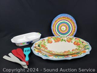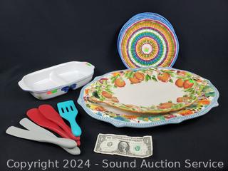 Lot #0181: 5 MAD Silicone Utensils, 4 Woven Paper Plate Holders, Temp-tations & Pioneer Women Platters