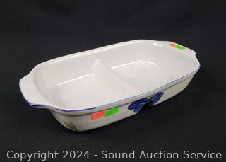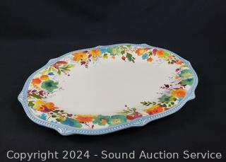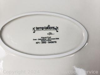 Temp-tations Figural Fruit 18" & Pioneer Woman 21" platters. 11" paper plate holders, Maxam divided stoneware dish.