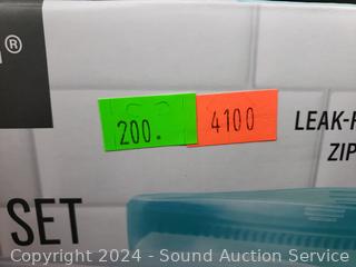 Leak-Resistant, Zipper Seal. (3) 1.5-Cup, (3) 3-Cup, 4 clear, 2 turquoise. Don't see any issues.