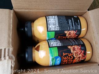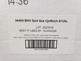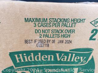 (1) 6pk 16oz Hidden Valley Ranch Dressing, best by Jan. 03, 2024, (1) 18LB box of Hidden Valley Ranch Dressing & Seasoning Mix, best by Jan. 06, 2024. (1) 6pk Hidden Valley Cajun Ranch, best by Jan. 16, 2024. Was factory sealed, opened for photos.