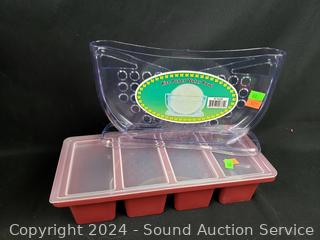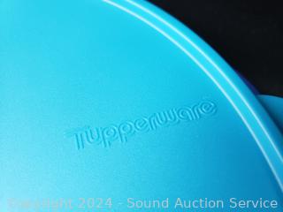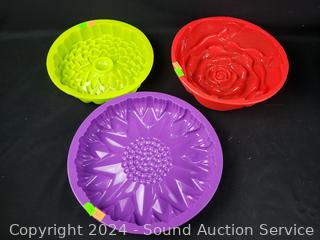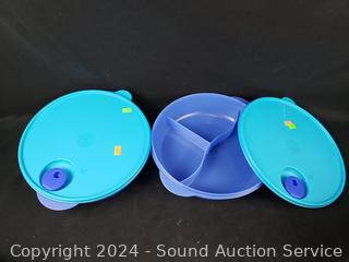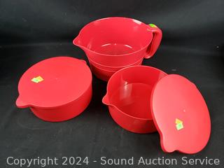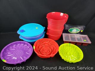 Red pitcher/strainer, 4 lidded bowls, rice paper water bowl, Curtis Stone Silicone divided dish, silicone cake molds, blue divided storage containers. All appear new, unused.