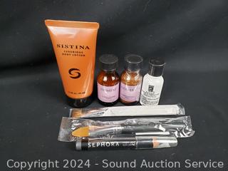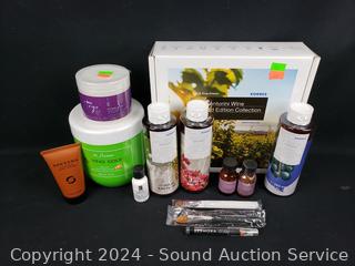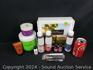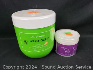 42.3oz M.Asam Vino Gold Peeling Exfoliant, Taya 4oz Kinwa Grain Styler, 3 Bottles Santorini Wine Renewing Body Cleanser, foundation, eye pencils & more. All appear to be sealed, unused. Refer to photos for more details.