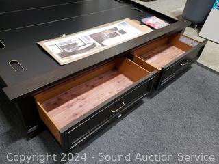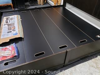 Oak veneers, rubberwood solids, dovetail drawer construction, cedar lined drawer bottoms, 4 USB ports built into side of headboard. We assembled, appears complete, platform deck piece at the foot has some damage, still pretty solid, some minor scuffs, dings, scratches. Overall good condition. 18" to 61" H x 81" W x 89" L.