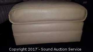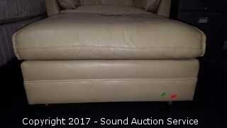 In good condition. Approx. 30" tall, 38" wide, 36" deep overall. 18" to seat, 27" wide seat. Ottoman is approx. 16" tall, 30" wide and 25" deep.