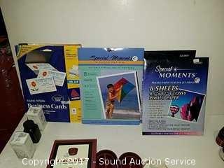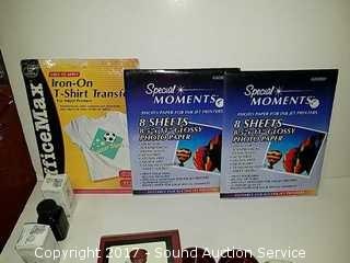 Includes: 3 calligraphy pens, a bunch of paintbrushes, markers, 4 bottles of ink, 4 packages of glossy paper, one pack of blank business card forms, and one pack of iron on transfers.