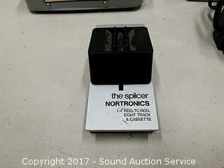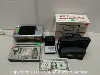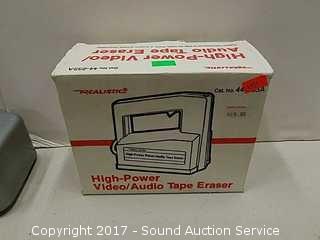 Includes: Vtg. High Power Audio Video Tape Eraser with original box, 1/4" splicer, tape and head cleaning kit, and other audio video tape eraser.