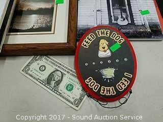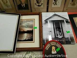 Includes: Feed The Dog plaque, black and white photographs, picture frames, black and white photo on wood artwork. Largest is 15" x 12" x 2", smallest one is 10" x 8".