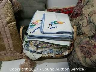 Includes: napkins, tablecloths, (5) 16" x 16" and 9" x 12" throw pillows and more. Many patterns, nice lot.