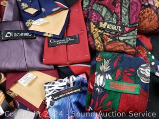 Some brands include, Christian Dior, Oscar Del Renta, Robert Talbott, Wembley, Ralph Marlin, Di Moggio, Prince Consort. Appear to be mostly silk & polyester.