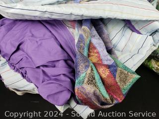 18" x 24" pillow (don't see any issues), 2 queen? bed skirts, 81" x 63" & 66" x 87"?.