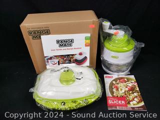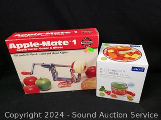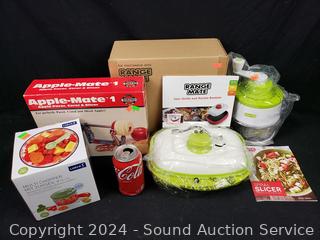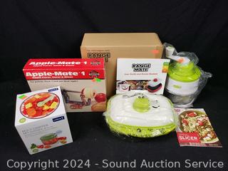 Lurch Multi-Chopper, Lime Spiral Splicer, Apple-Mate Parer, Corer, Slicer, Range Mate Microwave Cooker. All appear new, unused.