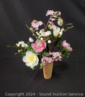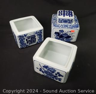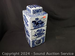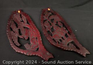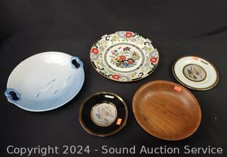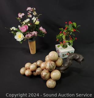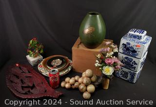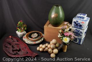 Stone grape bushel, faux plant, ceramic canisters, Chokin & other plates, vase, carved panels & more.