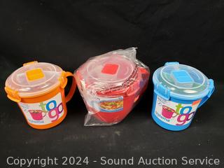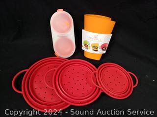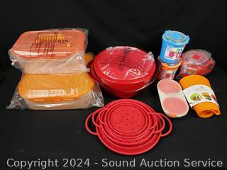 Soup mugs, Frywalls, silicone colanders, food storage containers. All appear new, unused. Refer to photos for more details.