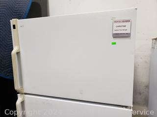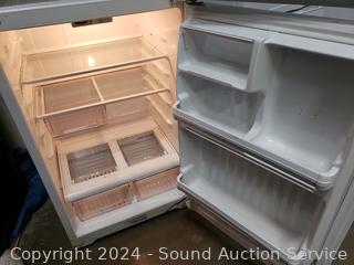 Appears to be functioning as intended, fridge and freezer getting cold. Came out of Bartell Drugs. Could use a proper cleaning, some dents, dings. 64.5" H x 28" W x 28" D. Model HTS16BRFRWW, Serial ZG751993.