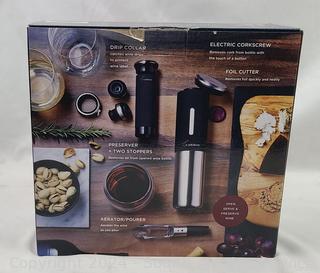 Electric corkscrew, aerator/pourer, preserver & 2 stoppers, foil cutter, drip collar, charging base. Appears to be functioning as intended.
