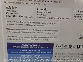 Unassembled din original packaging. Matte black finish with antique brass finish, tiered lights with champagne glass. 4-way column switch. 72" H x 17.5" W overall.