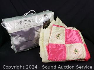 Lot #0250: Vtg. Nylon Quilted Embroidered Blanket & Green King Comforter