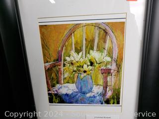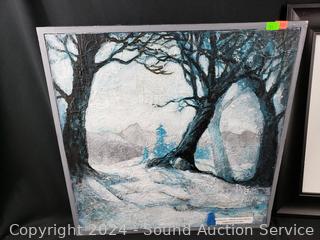 Oil Painting on canvas, untitled (Winter Scene, Bluish), 17" x 17". Summer Bouquet Acrylic, 18.5" x 15.25". Autmn Leaves & Pine Branches Tell a Story, no frame, 26" x 22".