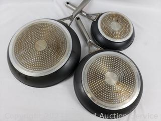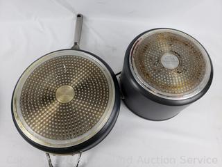 2.5qt, 3.5qt saucepans, 6.5qt boiling pot, 8", 10" & 12" skillets/frypans. Minor wear from use, scuffs.