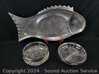 Lot #0125: Arthur Court 1975 Etched Fish Platter, 2pc Silver Plate Trim Serving Bowls