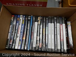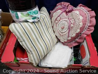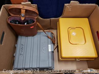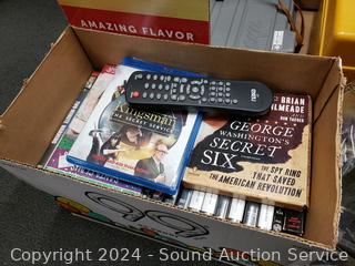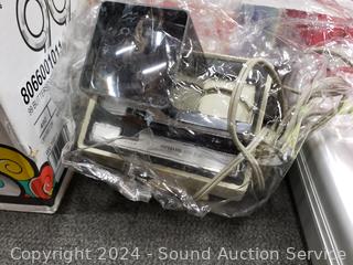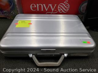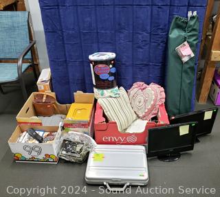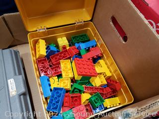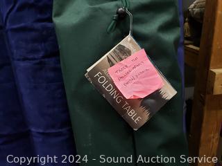 MaCabee Aluminum folding table (top falling apart), Fleece throw (appears unused), Haliburton Aluminum Briefcase with Combo(357), DVD's, Building blocks, 2 small TV's (1 works, other no power supply) & more. ATTN: Items may be missing pieces, damaged, not functioning, complete, no issues, etc. All items as is. Refer to photos for lot contents.
