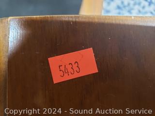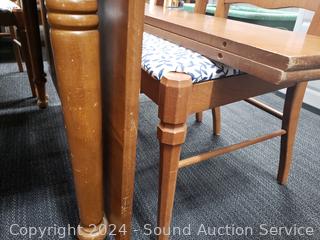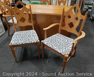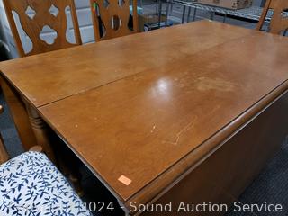 2 chairs are captains chairs, (2) 24" drop leaves, (2) 12" insert leaves. Various scuffs, scratches in finish. 29.5" H x 46" x 27" not including leaves. Refer to photos for more details.