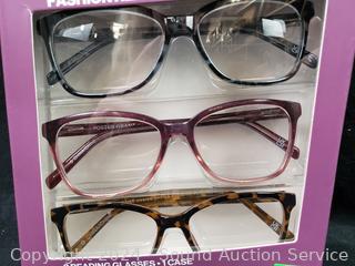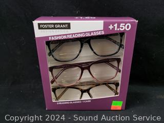 Lot #0235: 3pk Foster Grant +1.5 Fashion Reading Glasses w/1 Case