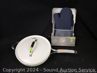 Lot #0257: 4pc KitchenAid Oven Mitts/Potholders & Tramontina 12" Skillet w/Lid