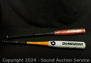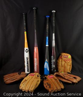 4 Rawlings & 1 Louisville Slugger mitts, Easton, DeMarini, Worth, Aero Strobe batts. Various wear from use.