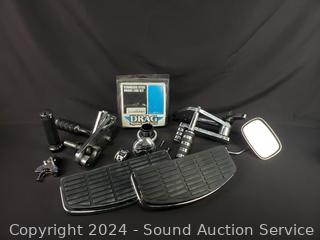 Mirror, footrests, brake line kit, shifter pedals (marked JB), fuel cap. Not sure what they fit, makes, models, etc.