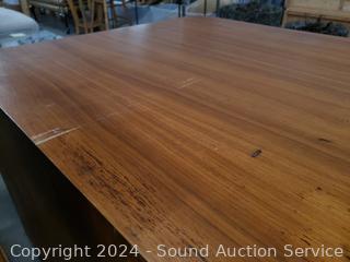 Various scuffs, scratches in finish. Dovetail joinery, teak veneer finish. 25.5" H x 30" W x 30".