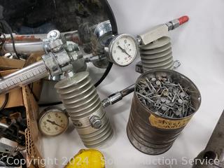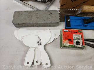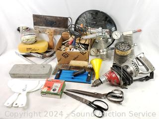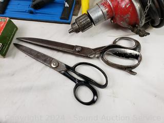 Wiss & other scissors, 12" Mirror, various hardware, Victor SR300 regulator, Miller Falls 3/8" drill (works). Refer to photos for more details.