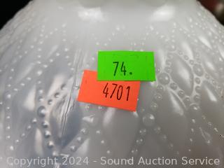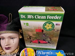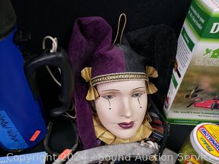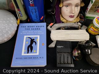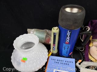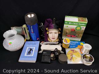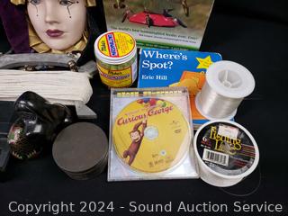 Porcelain mask, frosted glass shade, trout bait, 2 flashlights, child's books, cloisonne egg, Curious George CD, rope. Refer to photos for more details.