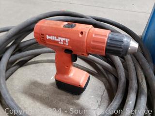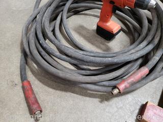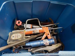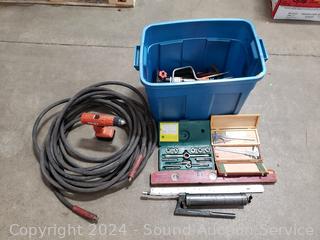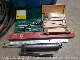 Lot #0327: Various Tools - Air Hose, Level, Tap & Die set, Jack, Grease Gun & More