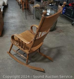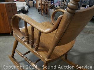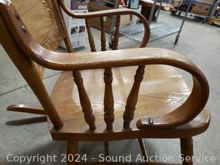 Lot #0002: Vintage Oak Pressed Back Curved Arm Rocking Chair