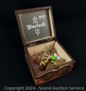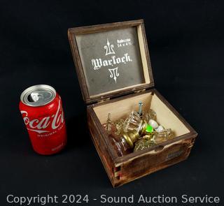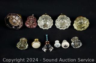 Lot #0102: 11ct Assorted Clear Glass & Porcelain Doorknobs & Drawer Pulls & Warlock Cigar Box