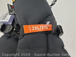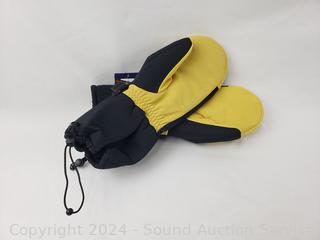 Mittens S:2XL, Bula one size fits all. Don't see any issues, mittens still have original tags.