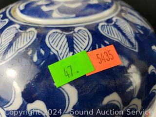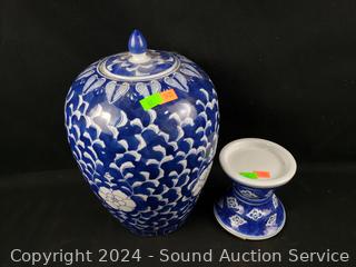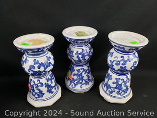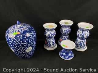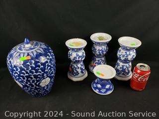 Lot #0047: 4 Blue/White Porcelain Candleholders & Urn