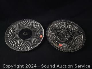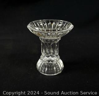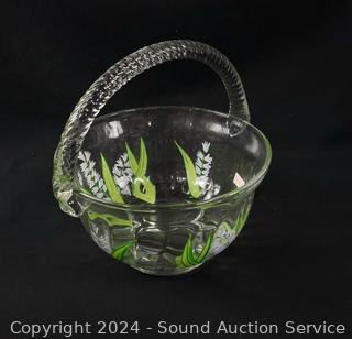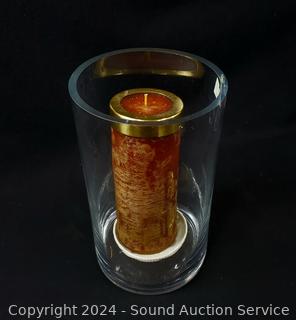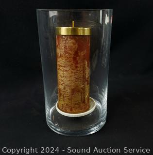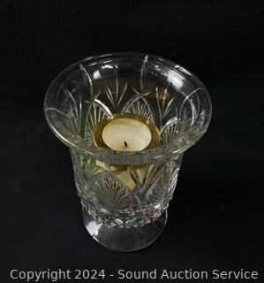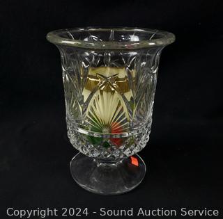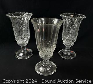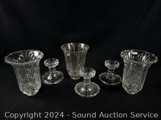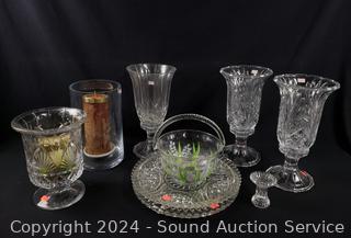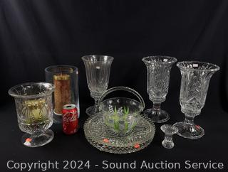 Lot #0094: Assorted Glassware Vases, Handled Basket, Hurricane, Candles